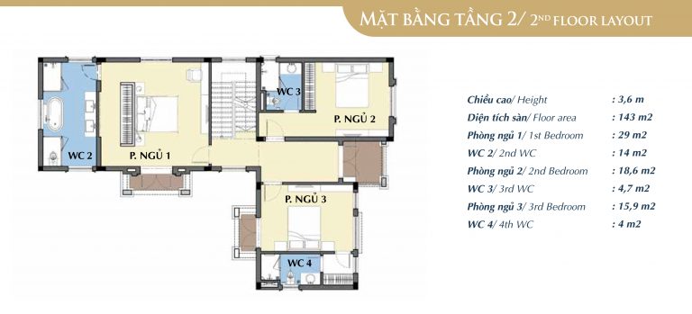 Tầng 2 có 3 phòng ngủ trong đó diện tích các phòng ngủ như sau: