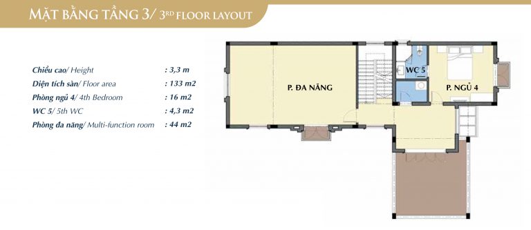 Tầng 3 gồm 1 phòng ngủ và 1 phòng đa năng có thể tuỳ biến theo nhiều mục đích sử dụng.