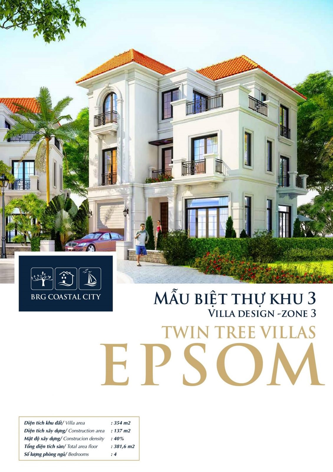 Khu Biệt thự Epsom tại BRG Coasltal City có diện tích 354m2 với tổng diện tích sàn 381m2, gồm 4 phòng ngủ và hồ bơi nhìn ra vườn sau xanh mát.