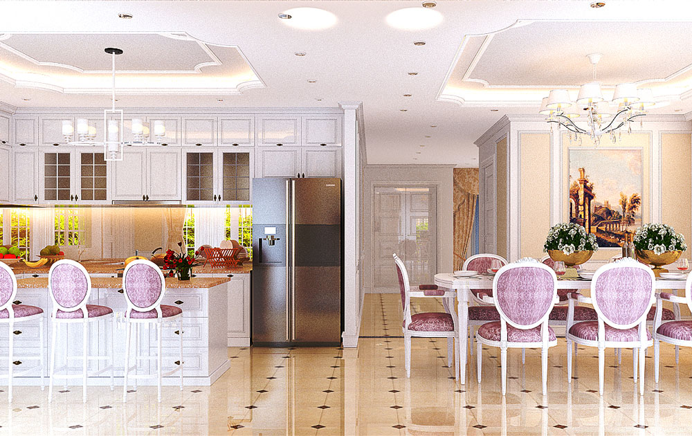Tầng 1 ngoài Gara lớn thì khu bếp cũng được bố trí rộng rãi và khu vực phòng ăn có thể nhìn trực tiếp ra khu vực bể bơi.