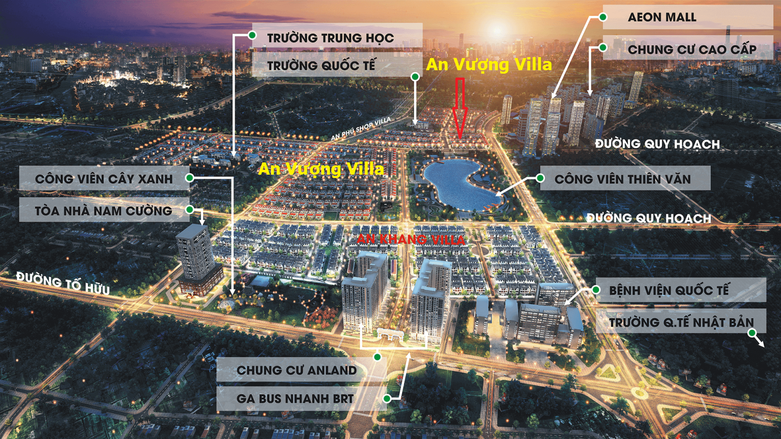 Biệt thự An Vượng Villa với vị trí đắc địa được dự báo sẽ tăng giá trị trong thời gian tới khi AEON Mall Hà Đông được khởi công; hoàn thiện và đi vào hoạt động. Với việc tọa lạc cạnh Trung tâm thương mại AEON Mall Hà Đông; đối diện khu 14.000 căn hộ cao cấp; mặt đường Lê Quang Đạo kéo dài, Ngô Thì Nhậm kéo dài; mặt hồ Bách Hợp Thủy và công viên Thiên Văn học mang lại nhiều giá trị sử dụng như: