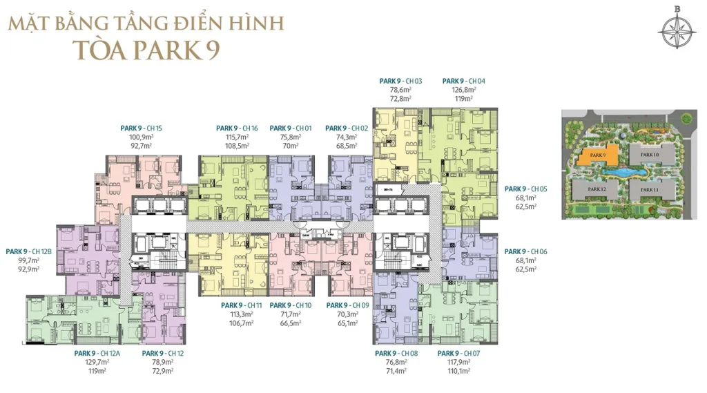 ♦  Căn hộ 4 phòng ngủ: Diện tích 129m – 157m nằm trong 3 tòa Park 9, Park 10 và Park 11.