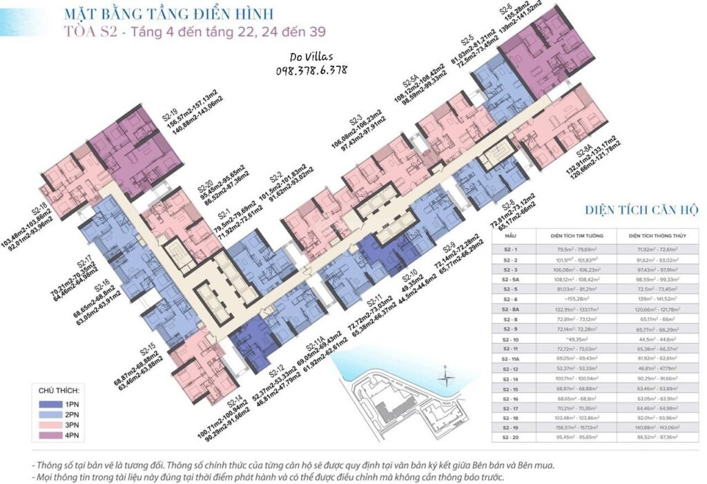 Tòa S2 Căn 02, 03, 05A, 20 giá từ 5.2 tỷ – 5,8 tỷ view hồ trọn vẹn (105m2 – 109m2).