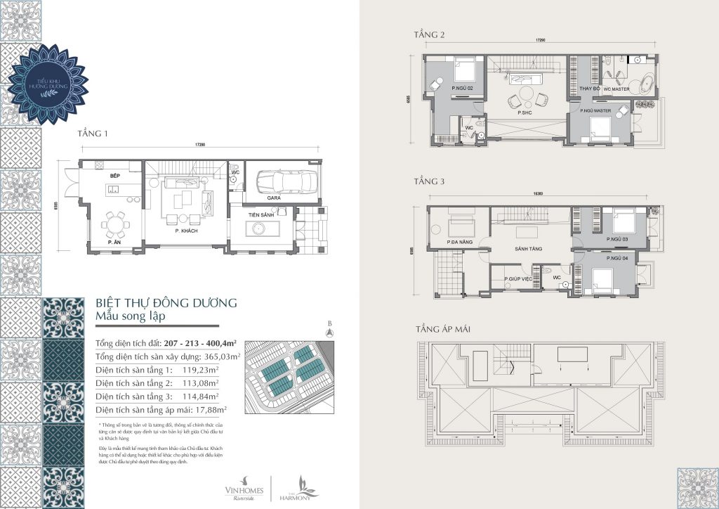 Biệt thự song lập Vinhomes The Harmony có mặt trong cả 4 tiểu khu: Phong Lan, Hướng Dương, Nguyệt Quế & Tulip, tương ứng với đó 4 kiến trúc: Pháp, Đông Dương , Hy Lạp & Italia. Thông tin chi tiết từng loại hình biệt thự song lập như sau: